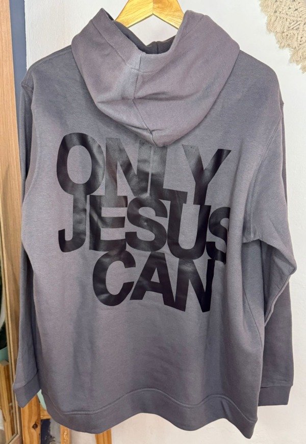 Buzo gris con capucha y estampa grande atrás SOLO JESUS PUEDE (en ingles) y adelante con bolsillo. Disponible talle XXL.