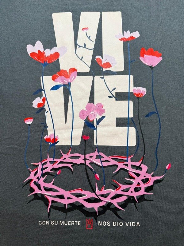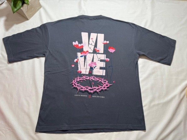 Remeron manga corta VIVE estampa grande atrás y chica adelante. Disponible talle L color gris.